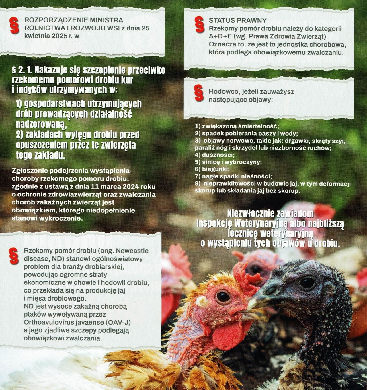 W przypadku podejrzenia wystąpienia rzekomego pomoru drobiu należy niezwłocznie zgłosić ten fakt powiatowemu lekarzowi weterynarii.